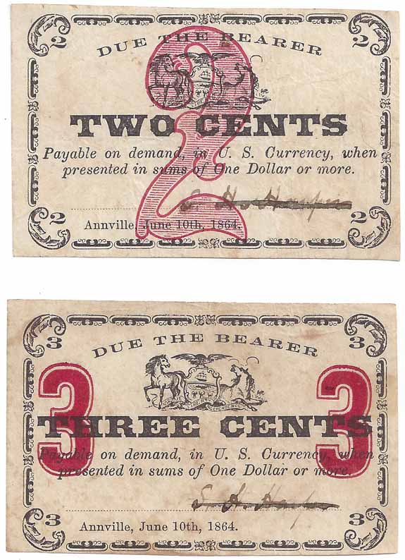 CC2911 | Two fractional notes (2c and 3c) from Annville (Pennsylvania) with the Pennsylvania State Seal (top center) dated June 10th, 1864. Local fractional script but quite scarce as USA fractional script was more easily available in 1864. Signed S. H. Harper which is lined through for an unknown reason. Very interesting pair of obsolete fractional notes from Pennsylvania VF-XF. |