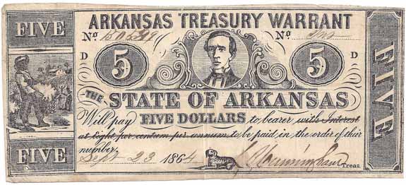 | CC2913 | $5.00 Arkansas Treasury Warrant (Little Rock) (CR-48C) 1864. White paper with a blank back. Arkansas Governor H. M. Rector.(center), Slave carrying cotton (left), Dog (bottom center). "ON AUDITOR"S WARRANT" removed from around portrait. Interest statement lined through F-VF. |