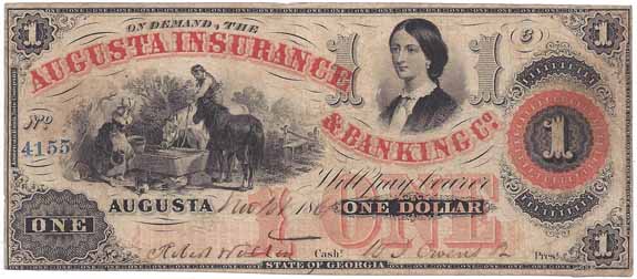 | CC2924 | $1.00 Note The Augusta Insurance & Banking Co. (Georgia) 1861. Man with Horses (left), Female Portrait (top right) Fine +. |