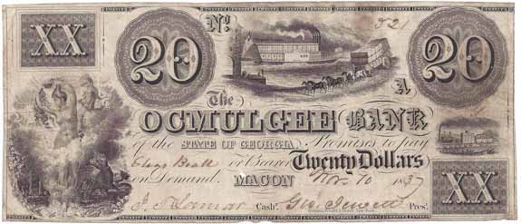 CC2928 | $20.00 Note The Ocmulgee Bank (Macon) of the State of Georgia 1838. River Scene with Horses pulling Freight Wagon, Steamboat (top center), Bare Breasted Navigation (female) with Child in an Allegorical Scene with what looks like a Sea Monster (lower left), Small Train (right). Small wear hole above the "M" of "Macon" Fine+. |