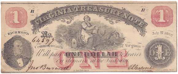 | CC2930 | $1.00 Note Virginia Treasury Note (Cr-17) July 21, 1862. Maid with Pail Seated on Log (center), Governor Letcher (lower left) XF. |