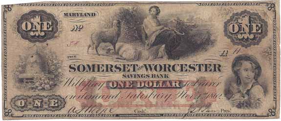 | CC2931 | $1.00 Note The Somerset and Worcester Savings Bank (Salisbury, Maryland) 1862. Seated female with scythe and sheep (top center), Bee Hive (left), Young female portrait (lower right) Fine. |