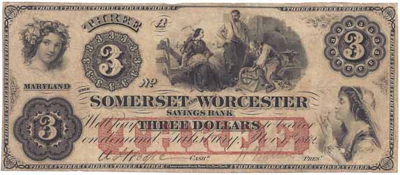 | CC2933 | $3.00 Note The Somerset and Worcester Savings Bank (Salisbury, Maryland) 1862. Two males and a female in farm scene and blacksmith (top center), female portraits (top right and lower left) Fine+. |