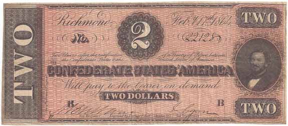 | T70 | CC2942 | CSA $2.00 Note (Judah P. Benjamin) Subtype Cr-569 "Engraved Keatinge & Ball Columbia, S.C." and "Litho'g by Evans & Cogswell, Columbia S.C." with no Serial Letter periods Fine. |
