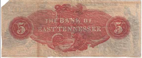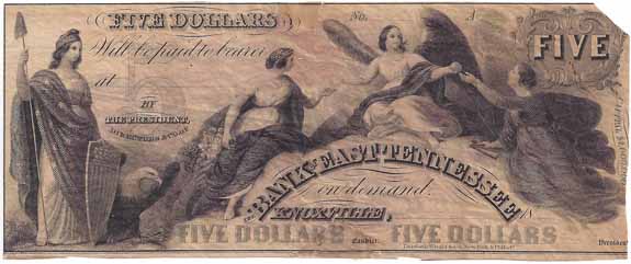 CC2954 | $5.00 Note The Bank of East Tennessee (Knoxville) 18--. Large central scene of two female figures with a winged angel between them, standing Liberty with cap and shield (left). Remainder Unsigned, Unissued. Faults with a clipped upper left corner, edge faults repaired. Still quite presentable and collectible Fine. |