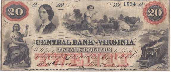 | CC2955 | $20.00 Note The Central Bank of Virginia (Staunton) 1860. Seated Maid with bucket and Cattle (top center), Female Portrait (top left), Seated Justice with Scales and Sword (lower left), Train (lower right) Fine. |
