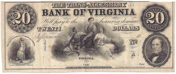 | CC2961 | $10.00 Note The Trans-Alleghany Bank of Virginia (Jeffersonville) 18--. Three Females - Commerce, Agriculture, Navigation (center), Male Portrait (lower right), Virginia State Seal (lower left). Unsigned, Unissued remainder F-VF. |