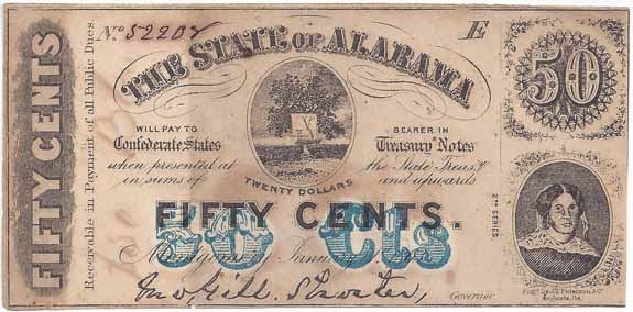 | T63 | CC2965 | 50c Fractional Note The State of Alabama (Cr-4) 1863. Alabama State Seal (center), 2nd Series (small letters), Portrait Juliet Opie Hopkins (lower right) XF. |