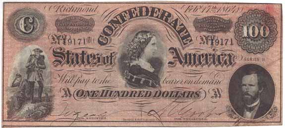 | T65 | CC2966 | CSA $100.00 Note (Lucy Pickens, Two Soldiers, and George W. Randolph) Subtype Cr-494 Series II AU. |