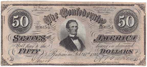 | T66 | CC2968 | CSA $50.00 Note (Jefferson Davis) Subtype Cr-501 1st Series, Flourish over "CON" VF-XF. |
