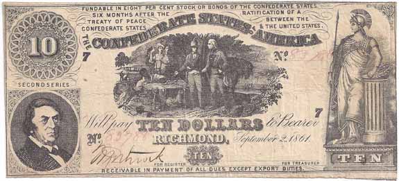 | T30 | CC2975 | CSA $10.00 Note (Sweet Potato Dinner, R. M. T. Hunter, Minerva) Subtype Cr-239 Second Series. Error Note: "For Treasurer" signature is completely missing at the lower right F-VF. |