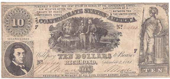 | T30 | CC2976 | CSA $10.00 Note (Sweet Potato Dinner, R. M. T. Hunter, Minerva) Subtype Cr-239 Second Series F-VF. |