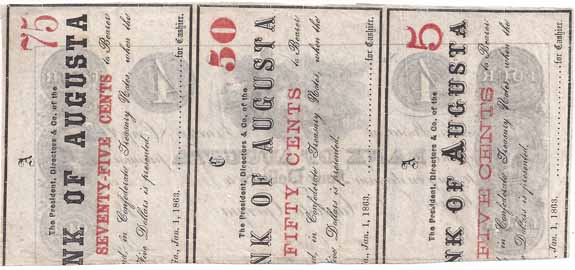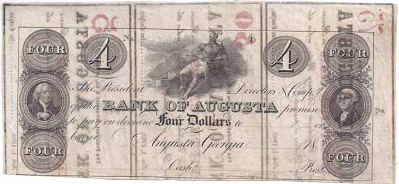 | CC2978 | $4.00 Note Bank of Augusta (Georgia) 18--. Archimedes lifting a globe (top center), Benjamin Franklin (left), George Washington (right). Printed on the back of a sheet of Bank of Augusta fractional notes. Unsigned, Unissued F-VF. |