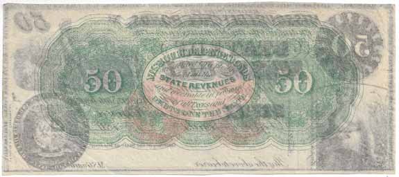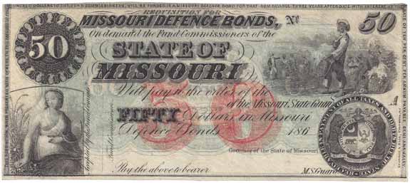 | CC2986 | $50.00 Note Missouri Defence Bonds State of Missouri (Cr-20) 186-. No Watermark. Seated Ceres (lower left), Slave Carrying Cotton and Overseer with Slaves Working in the Cotton Field (upper right), Missouri State Seal (lower right). Unsigned, Unissued, remainder XF. |