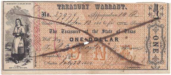 | CC2990 | $1.00 State of Texas (CSA) Treasury Warrant (Cr-1) for Civil Service July 23, 1862. Standing Milkmaid holding Pail and Cow in the background at left. Small ink erosion hole center. The back is blank F-VF. |