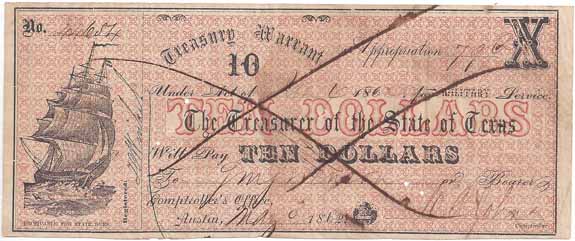 | CC2991 | $10.00 State of Texas (CSA) Treasury Warrant (Cr-17) for Military Service May 8, 1862. Large Sailing Ship (left), small Beehive (bottom). Four small neat punch holes F-VF. |