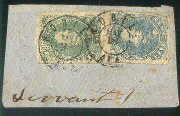 CSA #1 Stone 2 and CSA #4 Stone 2 USED in Combination for the double rate over 500 miles (both stamps are 4-Margin but the CSA #1 overlaps the top part of the CSA #4) tied to each other and to a small blue paper piece by two strikes of the Mobile, Ala double circle CDS 18 MAY (1862). Excellent combination piece. |