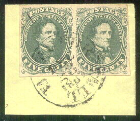 CSA #1 Stone 1 Horz Pair USED (4-Margin) tied to small yellow paper piece by a full strike of the Tudor Hall, Va CDS 23 DEC 1861. Extremely Fine. |
