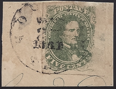 CSA #1 Stone 1 Position 10 USED (4-Margin with a large right sheet margin) tied to small piece by the Houston, Tex CDS 2- DEC 1861. The stamp shows a small linear random stone flaw at the lower right and a prominent short transfer at the lower right. Very Fine. Ex-Powell. |