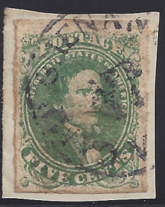 CSA #1 Stone 2 Position 14 USED (4-Margin) tied to small piece by the Camp Shenandoah, Va CDS 11 APR (1862). A small post office complete with a postmarking device was established at Camp Shenandoah, Va in Augusta County in the Shenandoah Mountains. There are only a small handful of covers known with this postmark (BE115 in the Bush Exhibit Section) and all are dated between 11 APR 1862 and 16 APR 1862 and all the known covers are army related. Camp Shenandoah served as a temporary army camp at that time. It seems apparent that the Camp Shenandoah post office was established in order to service the army mail as the post office ceased operations by 20 APR 1862 when the army moved on. The Camp Shenandoah, Va postmark is listed as an army field postmark in the 1986 New Dietz catalog but has been deleted from the army listings by the editors of the new CSA catalog with the statement that the post office was opened on personal initiative and did not have official status. Unfortunately, the Camp Shenandoah mark is not illustrated or valued in the new CSA catalog. Whether the Camp Shenendoah post office was official or unofficial is really beside the point. It was definitely a functioning temporary post office serving the army with its own postmark of which there are less than 10 recorded covers and only a few recorded off-cover stamps with this postmark. All the stamps are 5c lithographs -- most are the 5c Blue with a few being the 5c Green. This stamp shows the earliest recorded date of use for this limited postmark. Minor edge gum toning, otherwise Very Fine. |