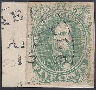CSA #1 Stone 1 (not plated) USED (4-Margin with a little edge gum toning) tied to small piece by the Hayneville, Ala CDS 15 APR. Very Fine. |