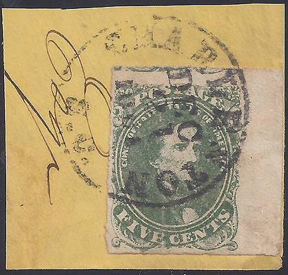 CSA #1 Stone 2 Position 40 USED (4-Margin with a right sheet margin and part of the adjacent stamp visible above) tied to small yellow paper piece by the large single rim Charleston SC CDS 21 DEC 1861. Very Fine. |