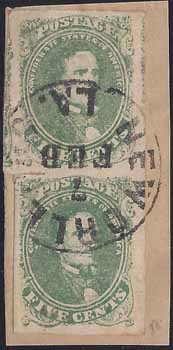 CSA #1 Stone 1 (not plated) Vert Pair (4-Margin with a portion of both of the adjacent stamps right and left of the top stamp visible and small scissors cut between the stamps at the left) tied to small piece by the New Orleans, La CDS 7 FEB (1862). Very Fine. |