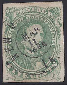 CSA #1 Stone 1 Position 12 (4-Margin) with a neat strike of the small double circle New Orleans, La., River Mail CDS 11 MAR 1862. Very Fine. |