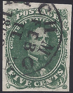 CSA #1b Dark Green Stone 1 (not plated) USED (4-Margin) Richmond, Va CDS 11 FEB (1862 Very Fine. |