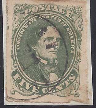 CSA #1 Stone 1 USED (not plated) (4-Margin with part of the adjacent stamp visible at the top left) affixed to small piece cut close to the stamp. Neat town CDS not otherwise identified and date not apparent. Very Fine. |
