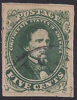 CSA #1 Stone A/B Dark Green USED (4-Margin with part of the adjacent stamp visible at the top left) affixed to small piece cut close to the stamp. Neat town CDS identified as Richmond, Va but date not apparent. Very nice stamp with an excellent impression and color that does not plate to Stone 1 leaving Stone A/B as the only real possibility. Very Fine. |