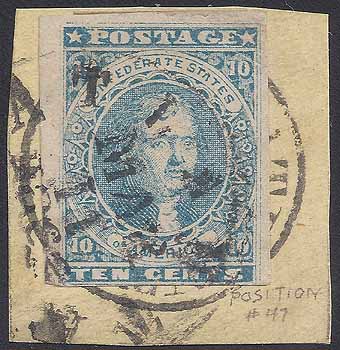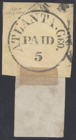 CSA #2 H&L Position 47 USED (margin touches the outer frame at the bottom) tied to small piece by the Atlanta, Ga CDS 11 MAR. The stamp was affixed over the obsolete Atlanta PAID 5 Provisional Handstamp CSA #6xu5. The stamp has been lifted and hinged back into place so that the provisional marking underneath can be demonstrated. Very Fine. Pencil notation on the back "Ex Lehrmann Coll." |