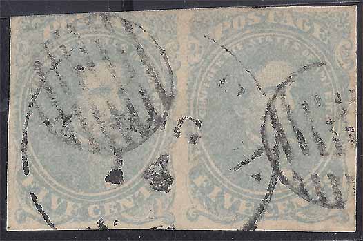| CS04/104 | CSA #4 USED Stone 2 Horz Pair Light Milky Blue 4-Margin (just a little close at upper right) with a neat but usual weak strike of the Aiken SC CDS 14 AUG (1862). Stamps also cancelled with 2 strikes of a framed 7-bar Grid. Aiken SC was not known to have used a grid, and these grids are most consistent with the receiving grids used at Winnsboro NC. Very Fine. | $375.00 |