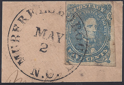 CSA #4 Stone 2 (dry printing not plated) USED (4-Margin but close at the left) tied to small piece by a full strike of the balloon Murfreesborough NC CDS 2 MAY (1862). |