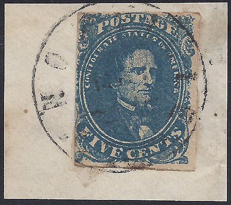 CSA #4a Dark Blue Stone 2 Position 13 USED (margin just touches at the left) tied to small piece by the large single rim Knoxville, Ten CDS with a MAY (1862) date. Very attractive stamp on piece. |