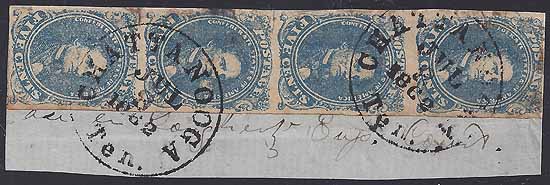 CSA #4 Vertical Strip of 4 Stone 3 Positions 2, 12, 22, 32 (margin tight at the top but clear on the other three sides) USED tied to small piece by two full strikes of the Chattanooga, Ten