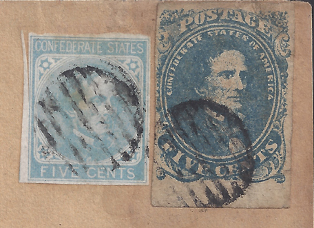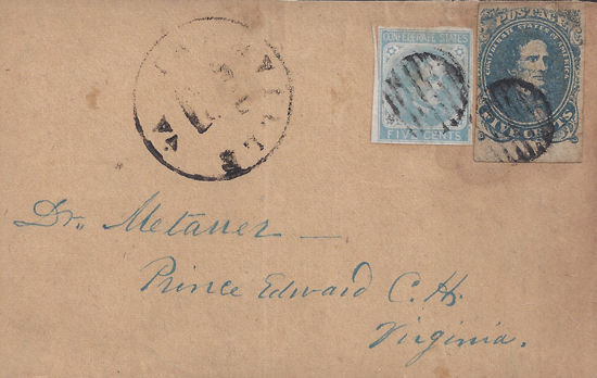 CSA #4 Stone 2 Position 42 (92) (margin close at left with a small bottom sheet margin) and CSA #6 used in combination to pay the 10c rate tied together and to a large piece by two full strikes of an enclosed grid. The large piece contains the Farmville, Va CDS with a JUL (1862) date and the address to Dr. Metaner, Prince Edward CH, Virginia. The grid cancels are consistent with the grids used at Farmville. |