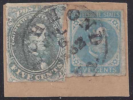 CSA #4 Stone 2 (not plated) (margin irregular at the right) and CSA #6 (4-Margin) used in combination to pay the 10c rate tied together and to a small piece by the Richmond, Va CDS Powell Type 3a 6 JUL 1862. |