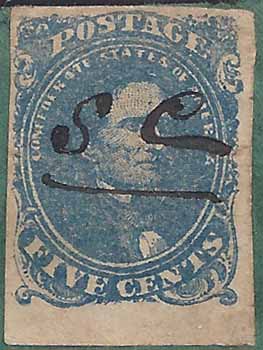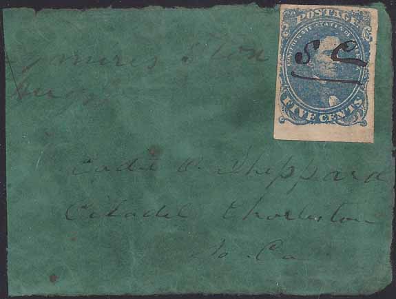 CSA #4 Stone 2 Position 50 (100) USED (4-Margin with a small lower sheet margin) with manuscript cancel "S C" for "South Carolina." Affixed to a large green paper piece with the address to Cadet O. Sheppard, Citadel, Charleston, So. Ca. Part of the manuscript postal marking is on the piece to the left of the stamp and can be identified as "Longmires Store" (Edgefield District SC) with an "Aug" date. Very Fine stamp on a piece associated with a Citadel Cadet.