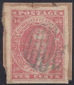 CSA #5 USED (Very Good Color) (4-Margin) Blue Grid Cancel affixed to small piece cut close to the stamp Very Fine. |