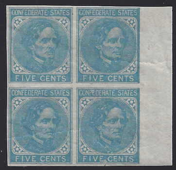 CSA #7 Block of 4 on London Paper UNUSED (4-Margin with right sheet margin) filled-in frames at the right OG with top two stamps Hinged. Pencil notations on the reverse identifies the stamps as from Positions 49-50, 59-60. |