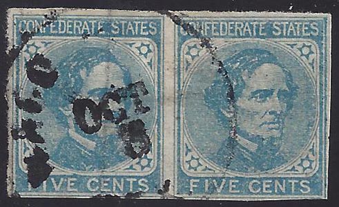 CSA #7 Horz Pair USED (4-Margin but close at the bottom) with the Waco Village, Tex CDS 8 OCT. This is quite a scarce Texas postmark. Ex-Powell. |