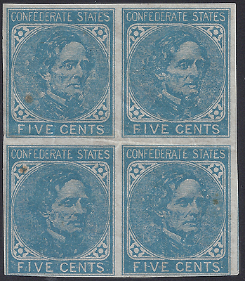 CSA #7 London De La Rue Paper Block of 4 UNUSED (margin close at the bottom) OG NH. Small toned spot upper left stamp. |