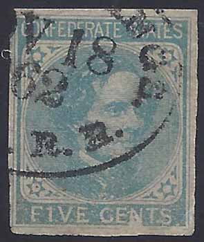 CSA #7 USED (almost 4-Margin with a small edge nick at the upper left corner) with the oval Estell Springs N & C RR (Nashville & Chattanooga Railroad) cancel 18 NOV 1862. Stamp also has a random transient printing flaw in the "N" of "CENTS" (CC 7-R-v7). |