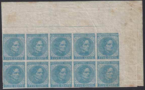 CSA #7 London Paper Upper Right Margin Block of 10 (Positions 6-10, 16-20) from the Upper Right Pane (4-Margin with large upper and right sheet margins but close at the bottom and the lower left corner). Prominent Brass Rules (inner and outer) at the top. This Brass Rules Block of 10 is listed in the CSA catalog as variety CC 7-L-v2. Filled-in-Frames at the right CC 7-L-v4. Streaky Richmond gum unevenly applied and NH Very Fine. |