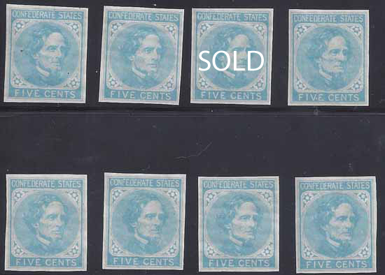 CSA #7 London Paper UNUSED (4-Margin) OG NH with the somewhat heavy, streaky, uneven Richmond gum Very Fine. Have 8 stamps cut from the same block. |