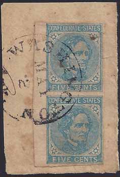 CSA #7 Vertical Pair USED (4-Margin with a small left sheet margin) tied to small piece by the Washington, Ark., CDS 2 MAY. Scarce Arkansas postmark. Tiny nick at upper right, otherwise Very Fine. |