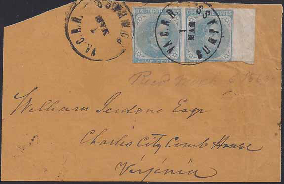 CSA #7 Horz Pair USED (margin in at the bottom but with a right sheet margin tied to large piece by two strikes of the Bumpass VA C RR (Virginia Central Railroad)