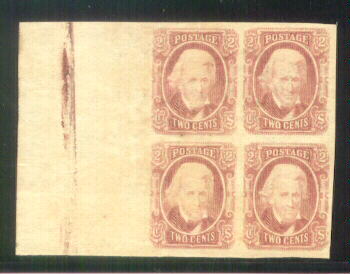 CSA #8 Block of 4 UNUSED (4-Margin with a Large Left Sheet Margin) OG NH with minor gum disturbances otherwise Very Fine. |