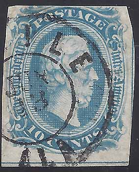 CSA #10a Frame Line Milky Blue USED (margin touches at the top) showing a complete line at the bottom and about half the line at the right. Neat strike of the small double circle Mobile, Ala CDS 13 JUN (most likely 1863). Pencil notations on the back indicating that the stamp comes from Position 37. No thins. CSA Certificate from 2005. |